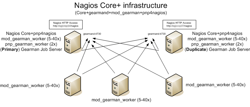 To this day there are new technologies that can provide a more interesting solution, first of all the wonderful Gearman. To link Nagios and Gearman another great piece of software was used: mod_gearman. This broker puts every job (checks/handlers/performance data) into the appropriate queue on the Gearman server, ready to be processed by workers on an arbitrary number of remote hosts (not exclusively dedicated to monitoring if you want).